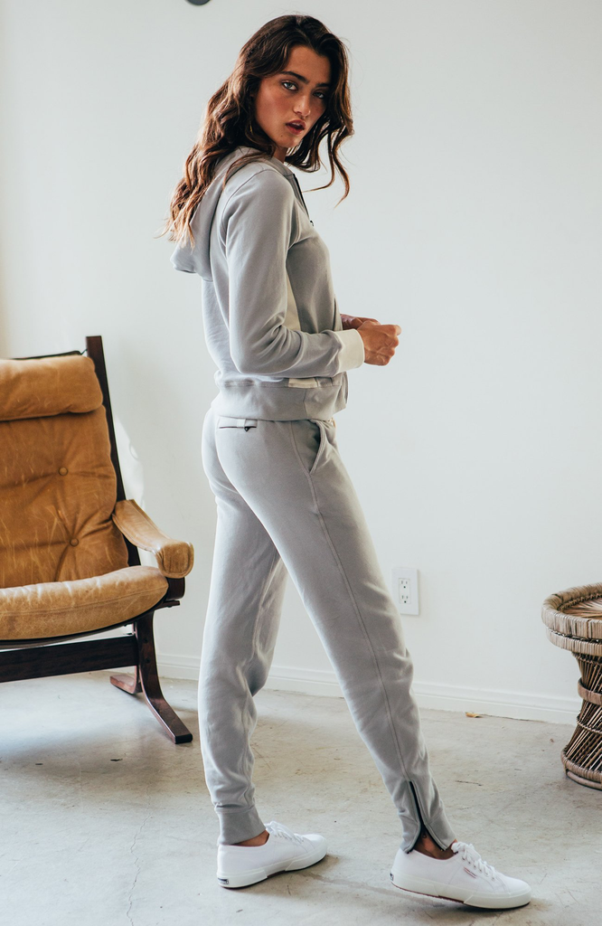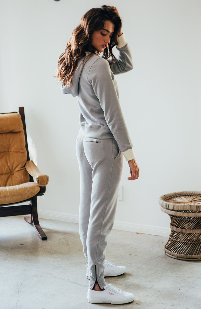 Our softest French Terry gets a lift with a duel Riri zipper and colorblock side panel details.